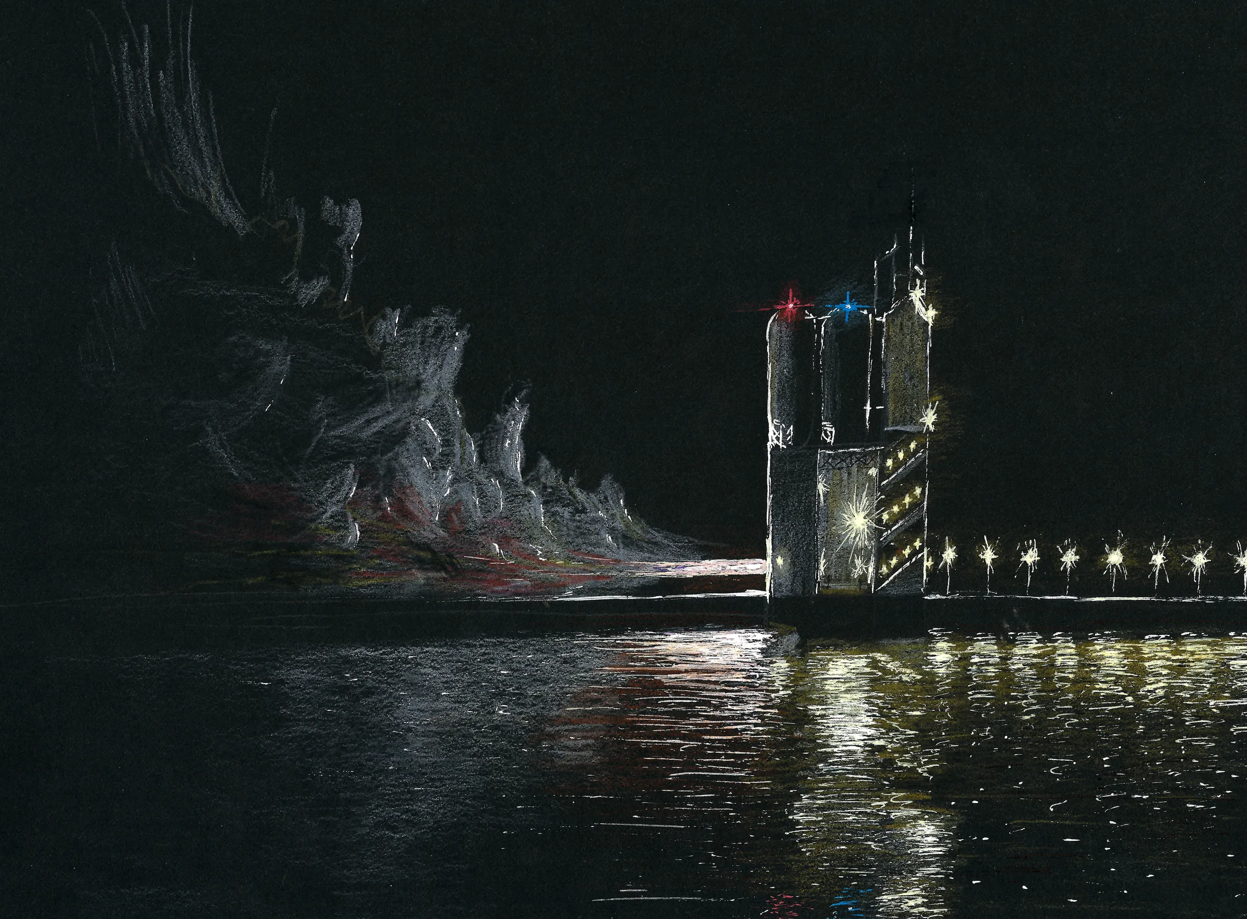 I thought maybe I'd draw a close-up, but when I was looking at images for inspiration, I found some showing reflections on water, which was just as pretty. I figured I'd draw both features, but at the resolution I ended up with, the Mach diamonds aren't really visible (though I did try to draw them in). I'm fairly happy with how the reflection came out—less-so, the test building.