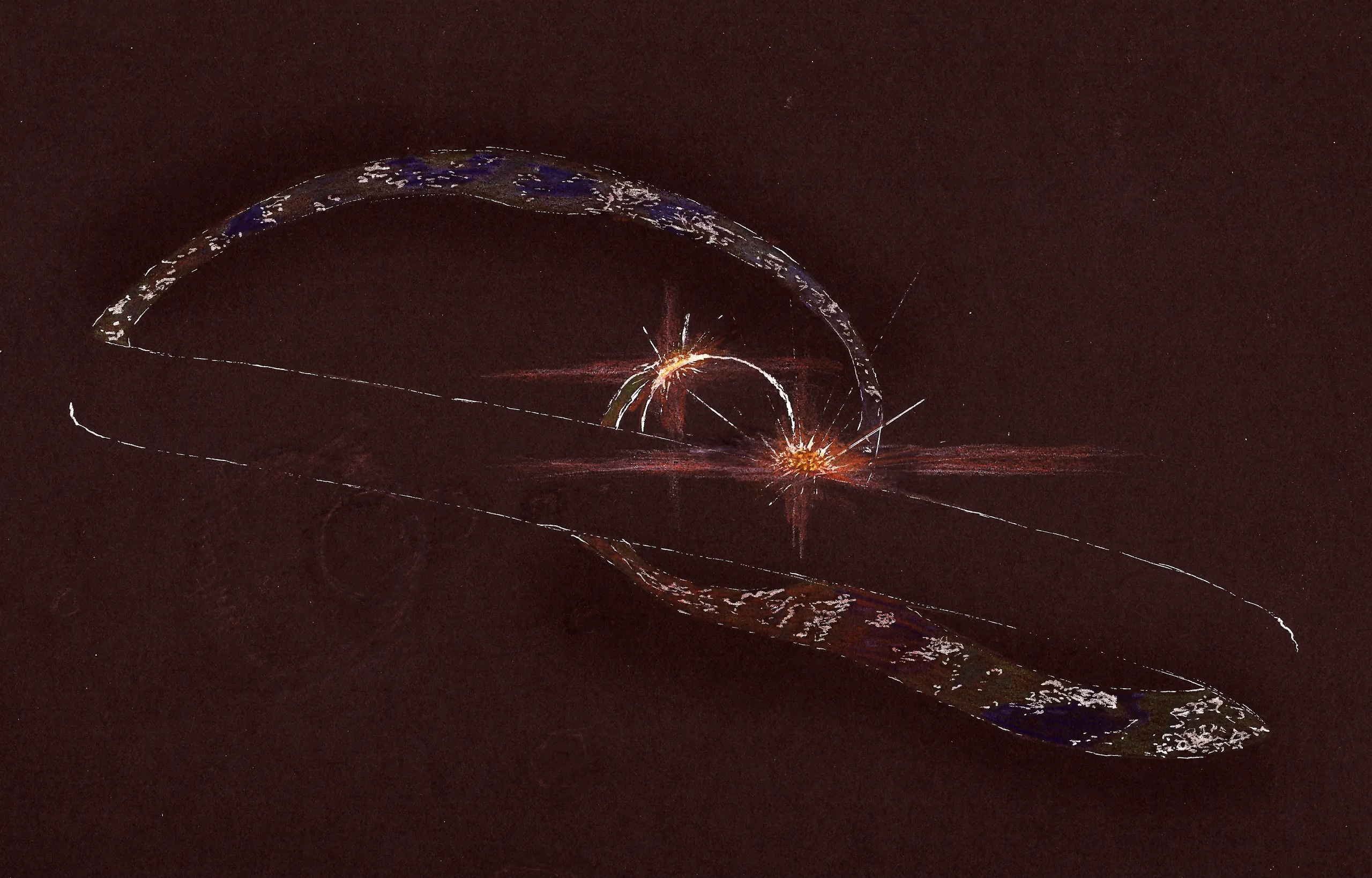 This is what it would look like. Although I initially tried sketching out what I thought it looks like, I didn't feel confident in my intuition to give me an accurate result. Therefore, I wrote a raymarcher and had my computer do the heavy lifting. It turns out I actually got it mostly right, but the ease with which I could make modifications led me to change the viewpoint to this, much-more-cinematic, perspective. I then sketched that out in a quick colored-pencil drawing, producing this.