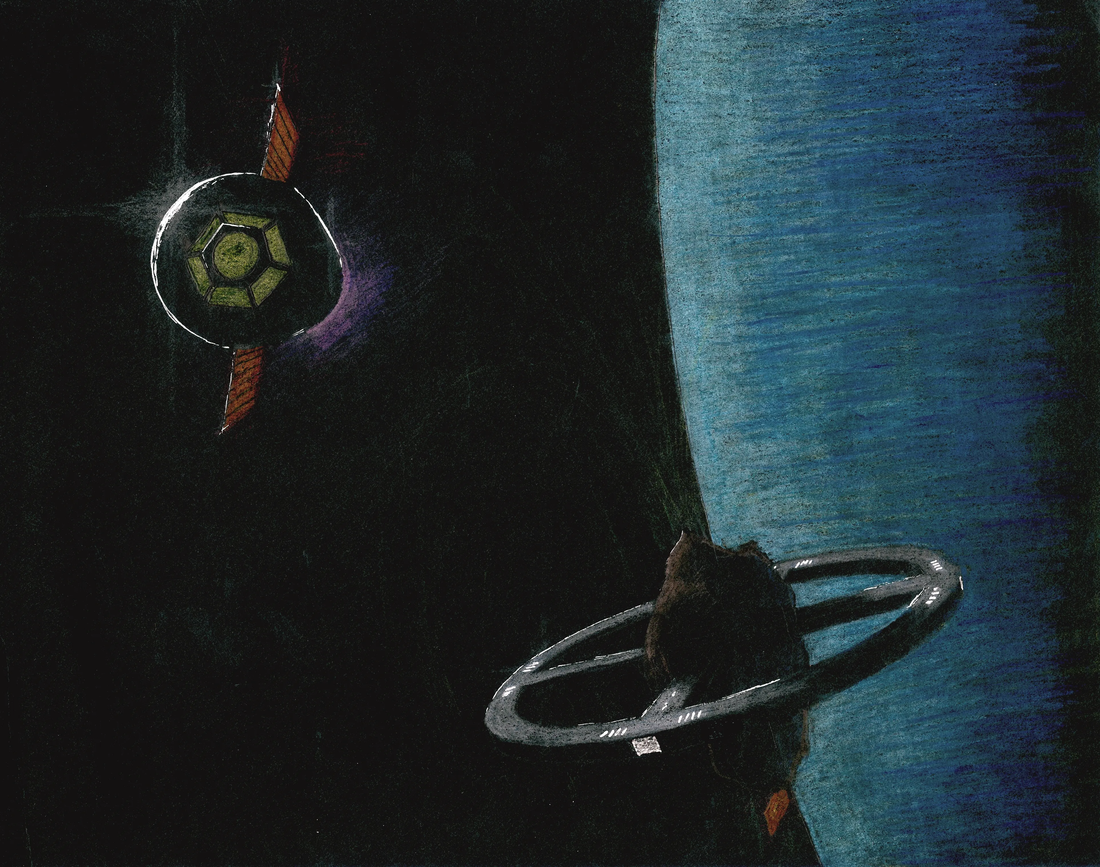 I tried rendering diffraction effects by hand. I'm quite pleased with how it came out. The asteroid is also casting a shadow on part of the ring. If you look very closely, you can see that the shadowed side of the station is slightly bluish from the reflected light off the planet. Unfortunately, the thick layering (on the planet especially) produces a reflective surface which doesn't scan well. I apologize for the generally poor quality (and I've tried to clean it up for you with some noise-reduction filters).