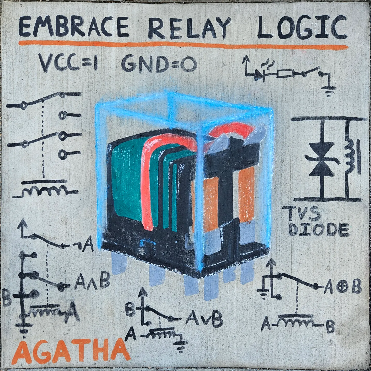 The best way to use chalk is to crush it up into a powder, mix with water, and apply like a paint. This covers a concrete sidewalk square more fully, and the result lasts longer. I was aware I was drawing the relay a bit small, as I was trying to finish quickly. Still, the outer space looked empty to me, and I filled it with some of the logic gates you can make out of relays.
