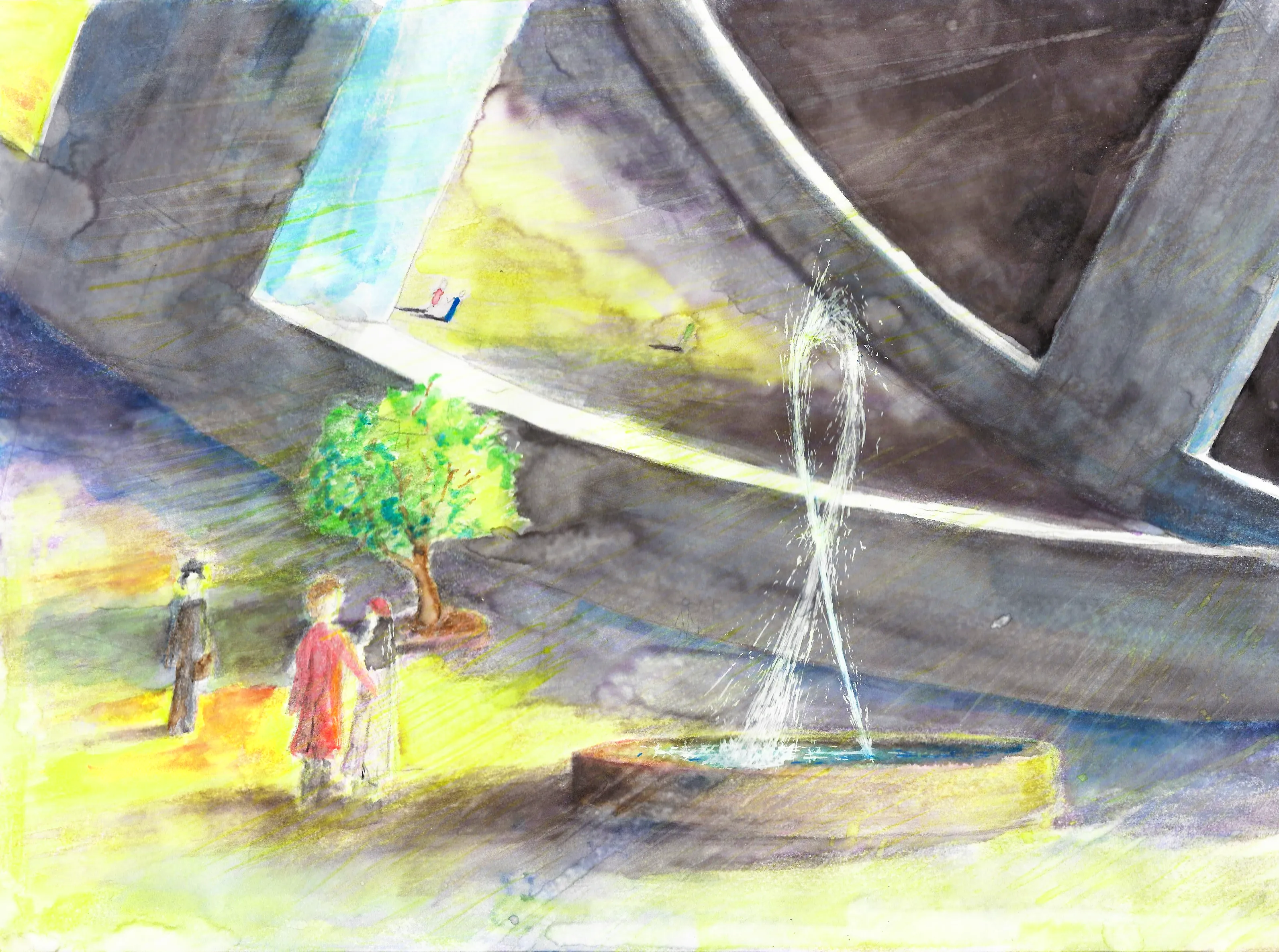 Here, I've drawn the 50 meter habitat with the fountain. Everything is roughly the right size/shape/scale—this is sortof what it would actually look like! The habitat is sparsely furnished; I guess they're still building it (or I'm too lazy to draw more stuff).