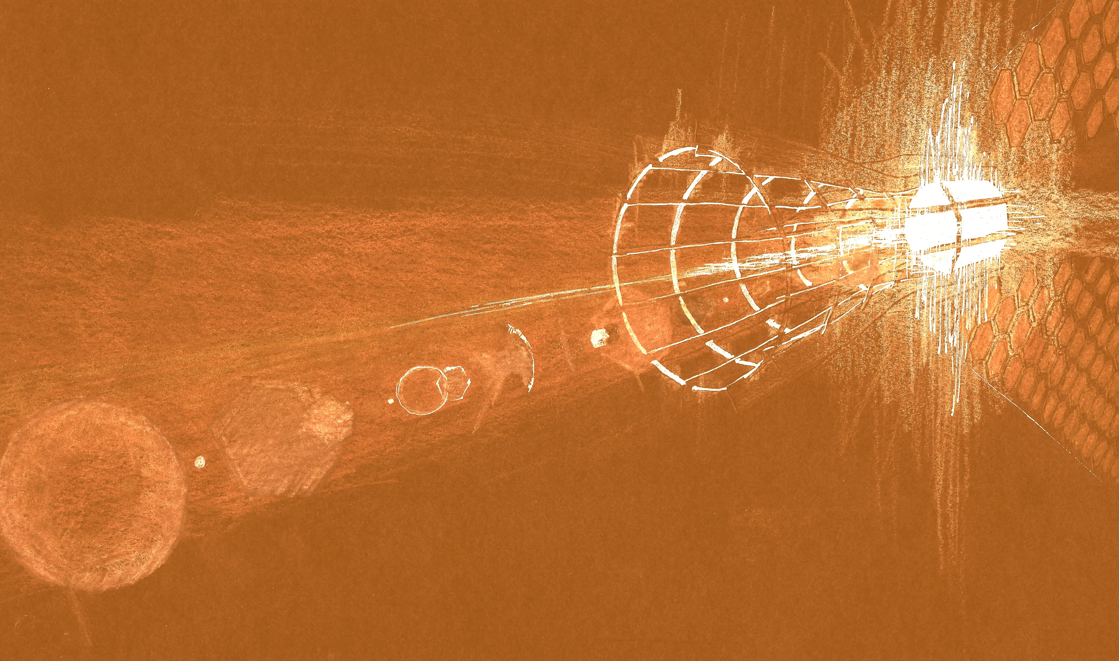 I'm experimenting here with drawing lens flares by hand. The key fact to know is that lens flares go through the center of the image. Also there's tons of diffraction, as you would expect from the massive glare of staring into a nuclear explosion. (You're also being bombarded by, like, an assload of invisible neutrons and ionizing radiation, but the magic of this being merely a colored-pencil drawing prevents you from dying horribly.)