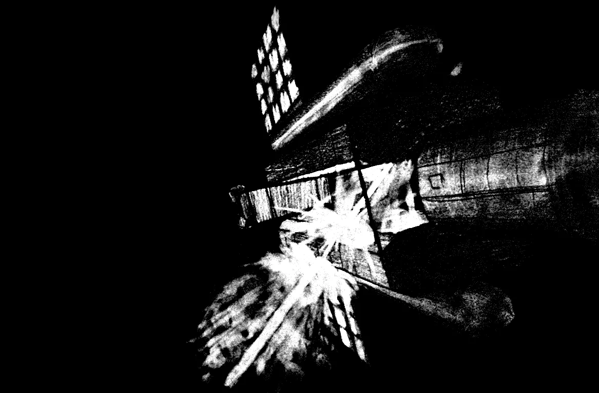 A spaceship eating a laser hit. I tried to add some things a typical artist wouldn't know to do. The laser is hitting tanks of remass, which is now expanding vigorously into vacuum. This provides a medium for the laser to be visible in (it is not visible outside the cloud). Most of the illumination in the scene is from the luminescent cloud, so the shadows are soft and diffuse. At this exposure level, stars are too faint to be visible—not because I was too lazy to draw them or something. Oh, and radiators, of course. A previous version was also released with less contrast but closer to the original sketch.