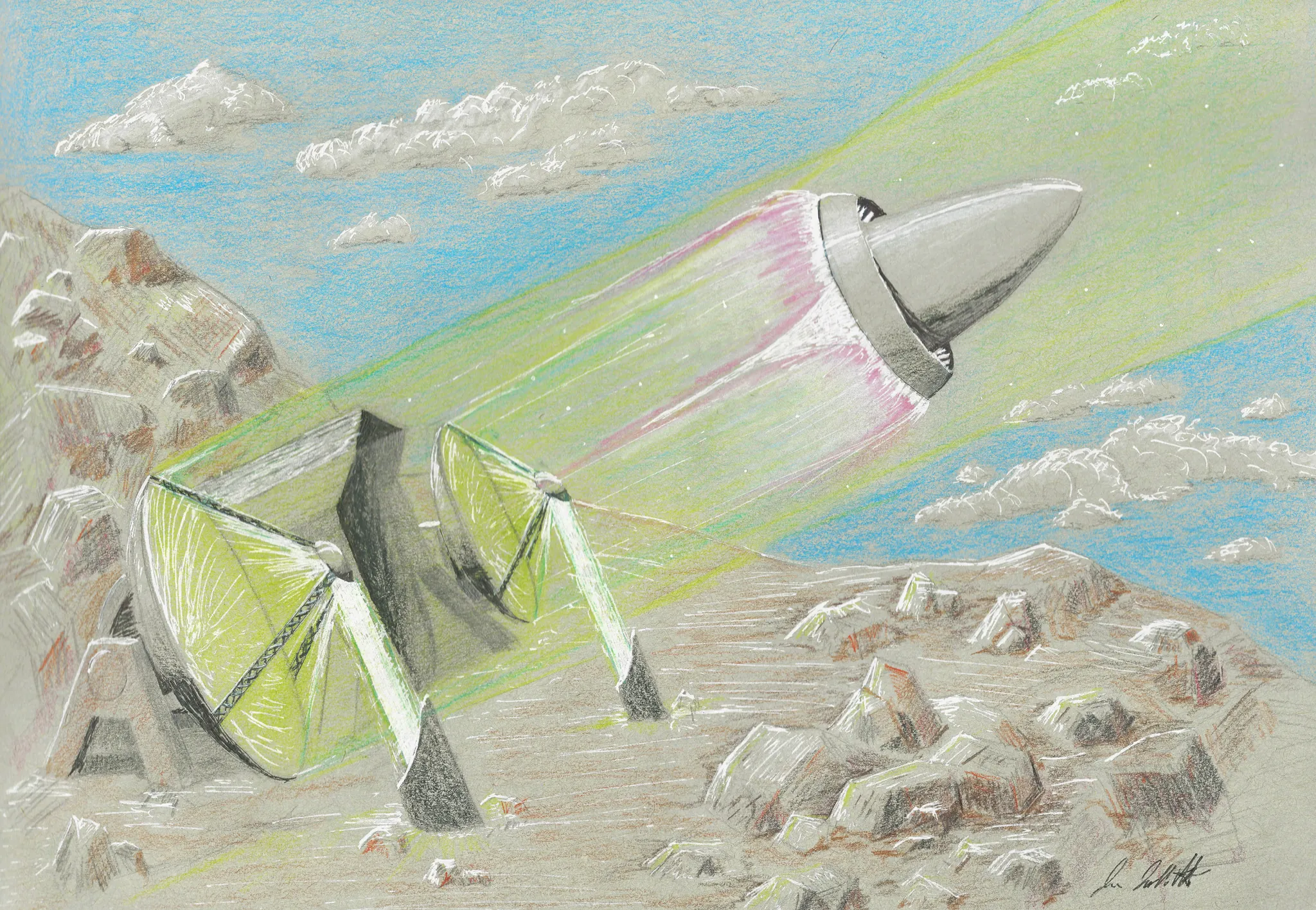 Mountain is Mt. Chimborazo in Ecuador (which is high, very close to equator, shallowly sloping, and has a good flat run to the west). The lasers are generated in an underground facility and piped up to the surface. They hit a few mirrors and then fly to the rear end of the spaceship, which has just been launched out of the tunnel between the two dishes. The spaceship itself has a mirrored and curved end, which focuses the lasers into an annular region. Air flowing in from the top is flashed into plasma by the lasers, and exits the back to propel the craft. When the air becomes too thin, a subsequent laser station, lasing in the blue this time, ablates the mirror for remass (the mirror is optimized to reflect green, you see).