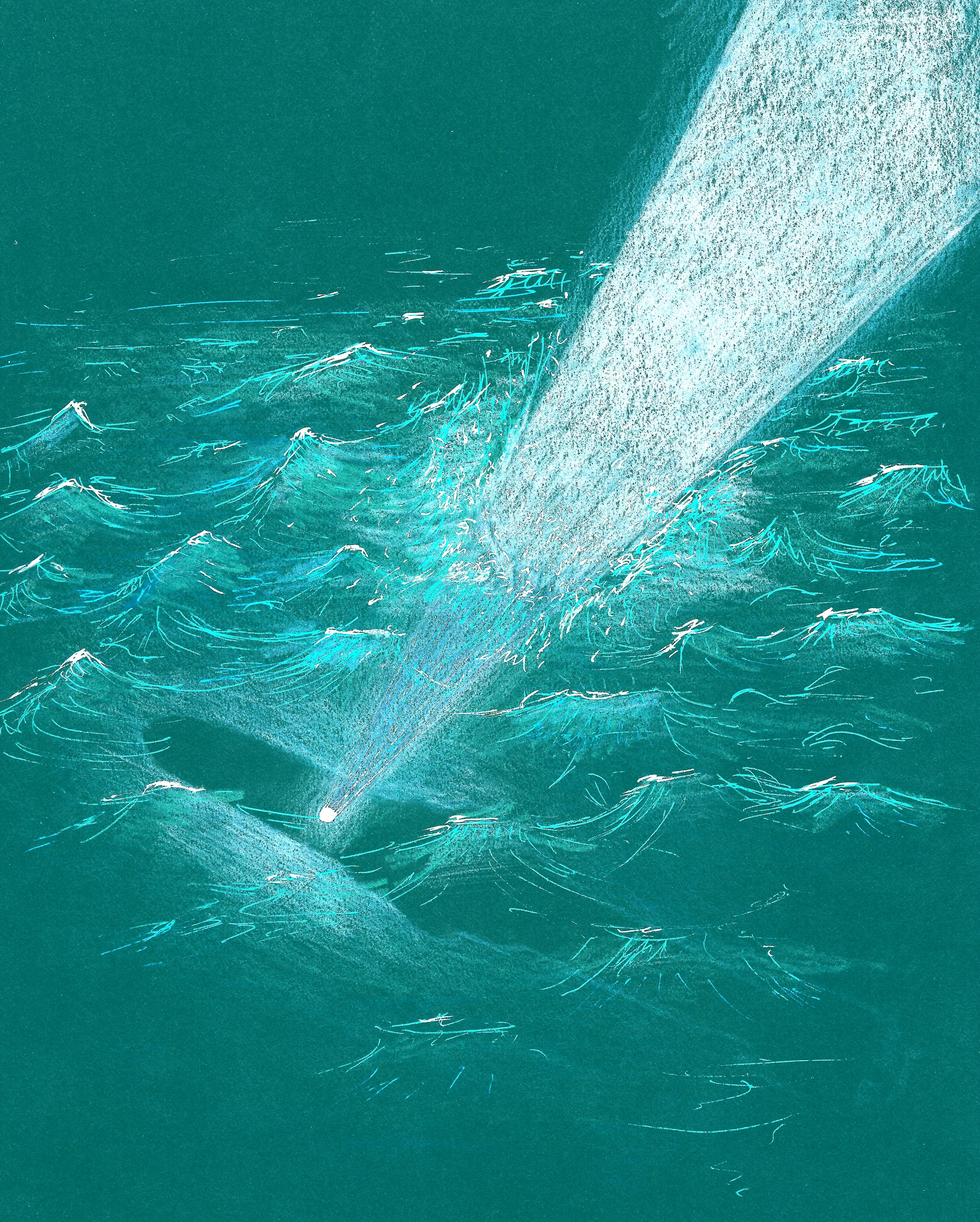 Artistically, this is colored pencils and gel pens. I was previously stuck with just using a white gel pen, but now I've gotten ones in other colors. I considered doing a red/orange/yellow drawing (i.e., some kind of explosion, most-likely), but I figured drawing illumination in the ocean would be more-interesting. I'm not fully pleased with how the waves came out, but they did come out decently, in my opinion, and it's certainly the best ocean I've drawn yet—so I'll take it.