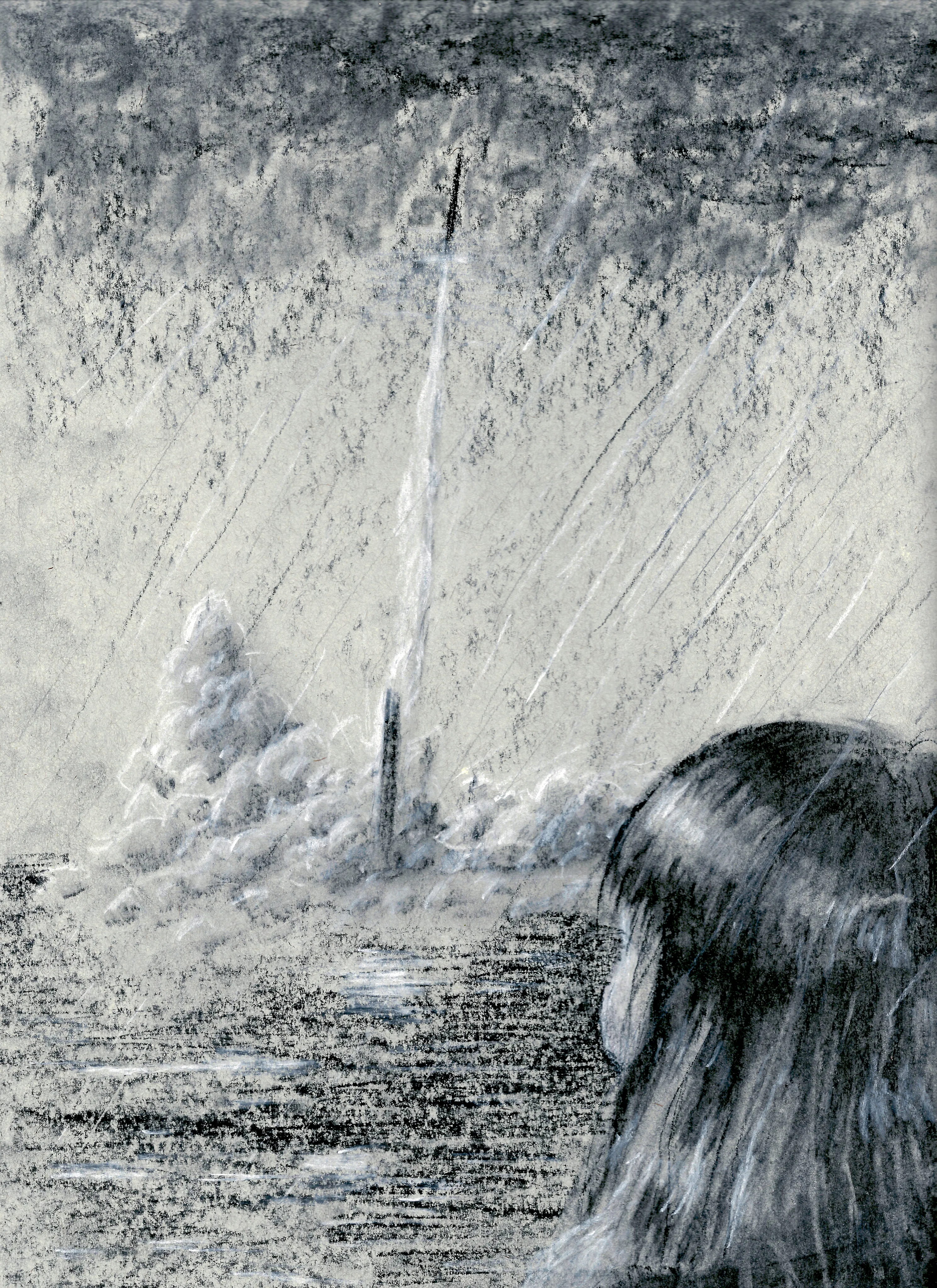 My charcoal isn't thin enough for fine detail, making the rocket look a like misshapen. It's also partially a scanning issue. I was thinking the rocket was some Falcon variant of the near-future.