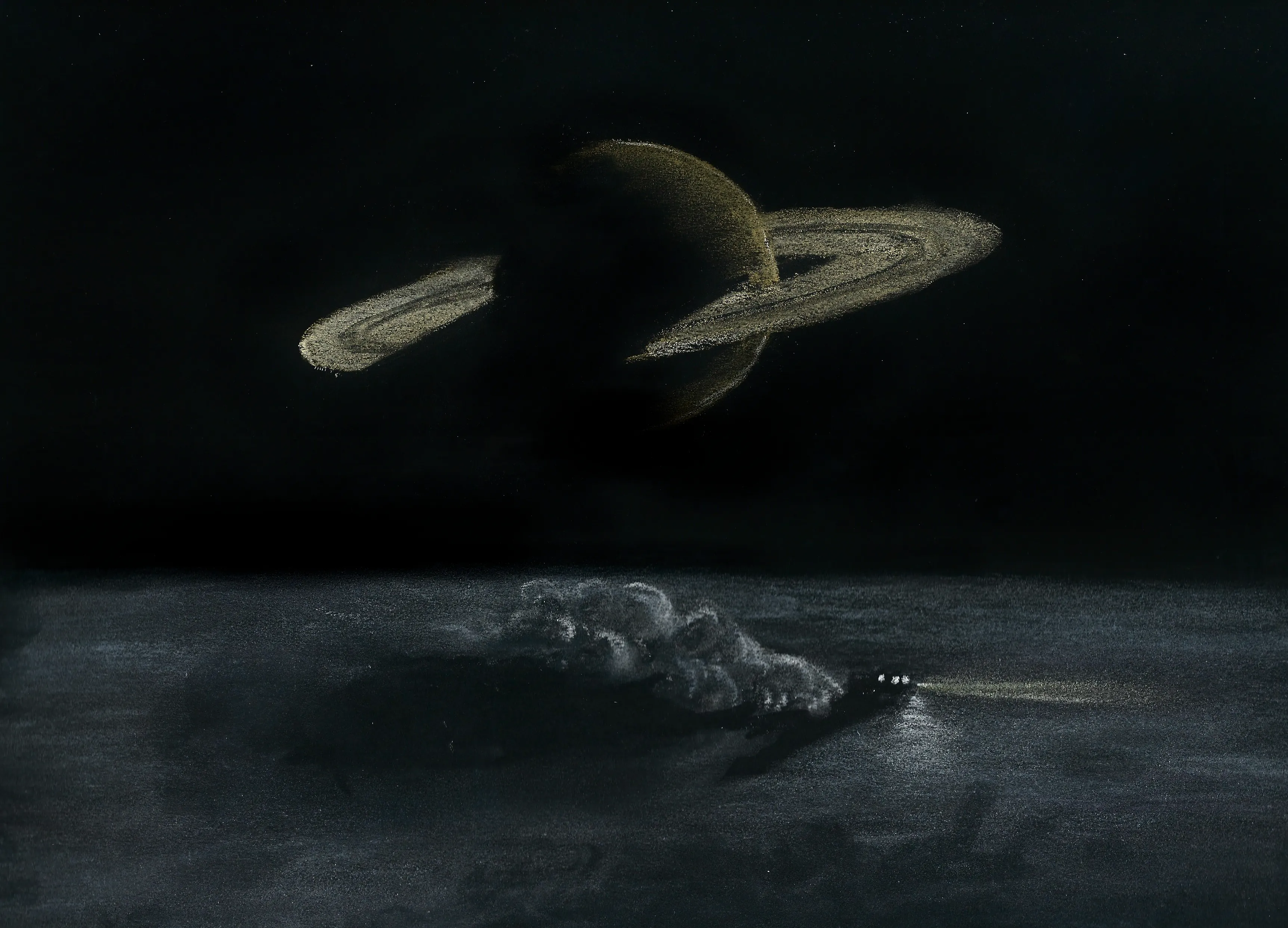 Artistically, this is colored pencil on black construction paper with a bit of cleanup after scanning. I traced a coffee mug for the disk of Saturn, but everything else is freehand.