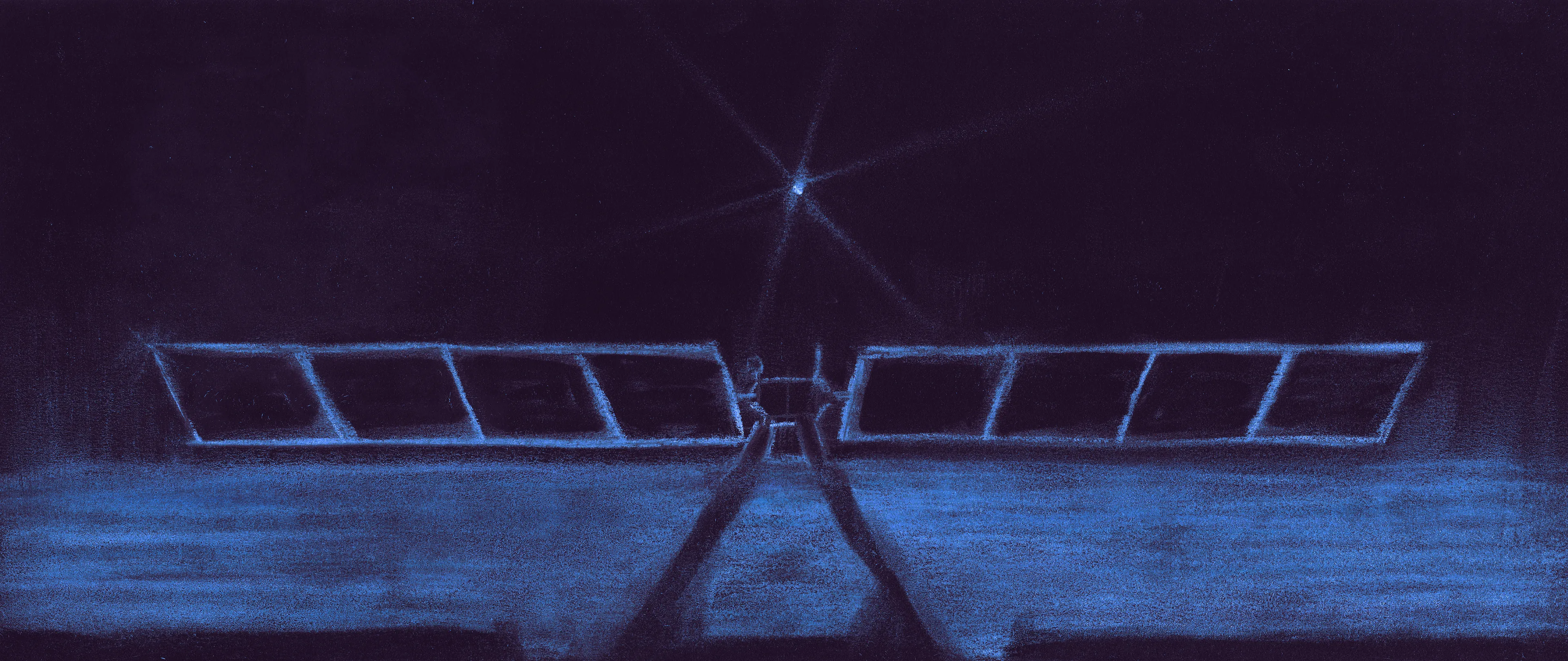 A solar-powered probe attempts to recharge on a distant body, perhaps somewhere like Pluto. It needs huge panels for its size, cutting deeply into its science payload. Probably there's a lesson here (use nuclear power), but really I drew this because I thought it would be an amusing image. Note the long shadows, rarefied but scattering atmosphere, and diffraction.