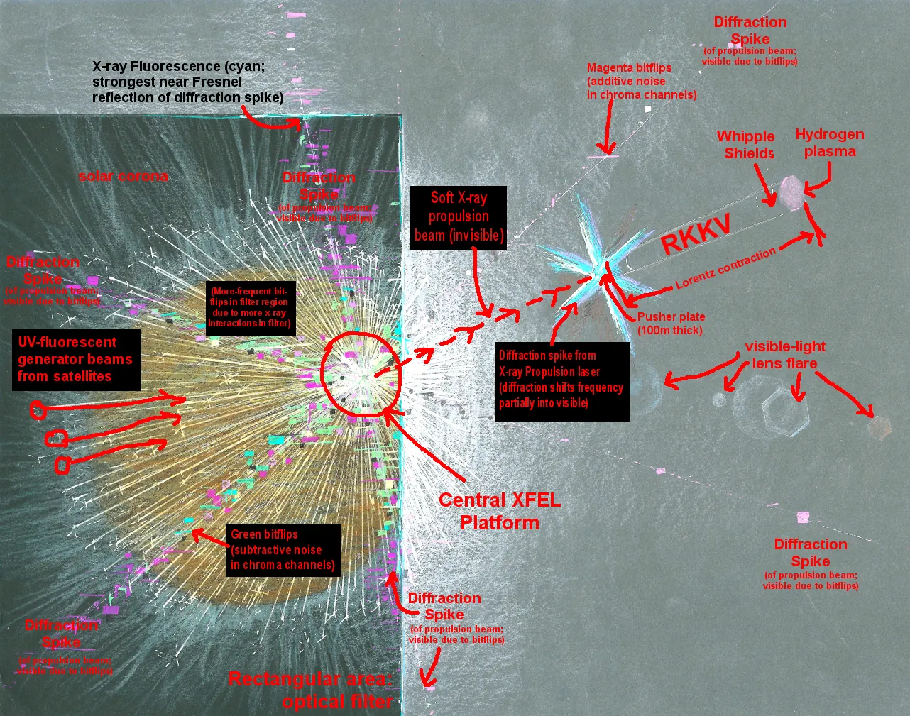 We can't see the propulsion beam, which is soft X-rays, directly, but its secondary effects are pronounced. As it hits the bottom of the spacecraft, it reflects and diffracts. However, since the RKKV is traveling at relativistic speed compared to us, the diffraction introduces to a frequency shift depending on angle. This explains why the green/blue/violet end of the rainbow is visible as a diffraction spike on the spacecraft: the diffraction shifts the laser partially into the visible spectrum.