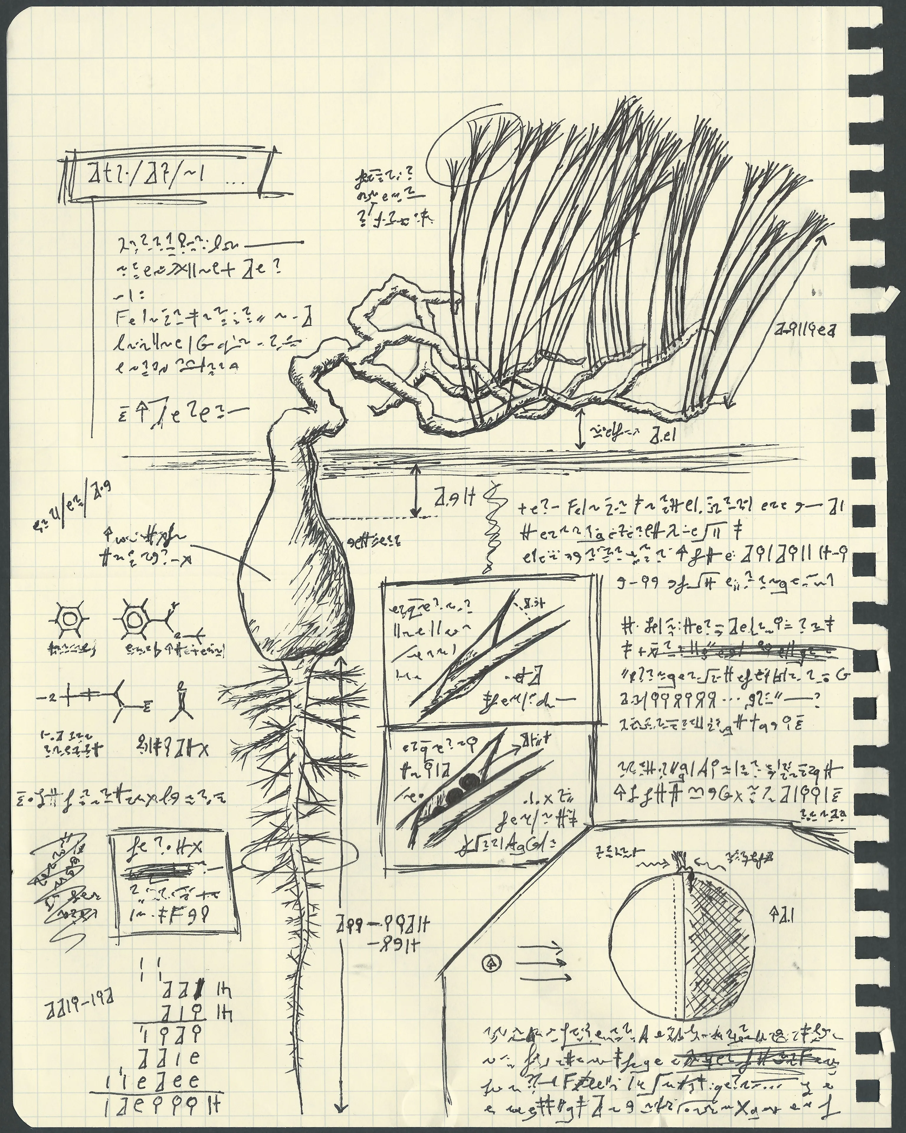 This is a page ripped from the field notes of a working xenobotanist. It covers a plant in the "twilight" ecosystem in the band around a tidally locked planet. Harsh winds blow (along the ground) from the cold to the warm side. The planet is adapted to this, with a deep root system and woody branches that run low along the ground. The fronds sticking up are thin, and have photosynthetic stalks instead of leaves, since the light comes almost exactly at 90°. Despite being tidally locked, the planet is a bit wobbly, sometimes casting the region into more or less shadow or light. The bulb at the bottom houses nutrients to tide the plant over during these inhospitable seasons.