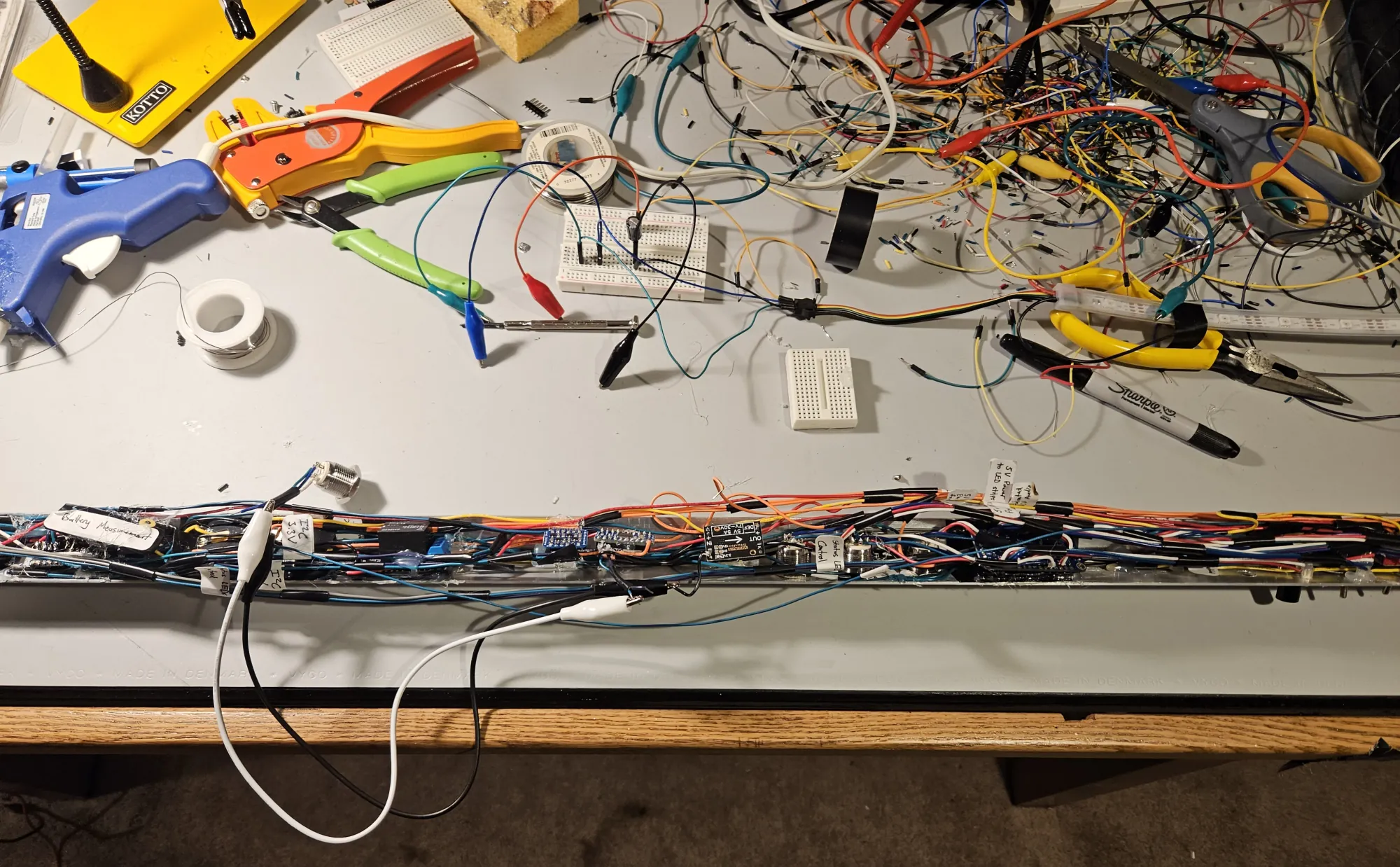 A Raspberry Pi Pico controls everything, and recognizing my (then more limited) electronics knowledge, most of the circuitry is off-the-shelf parts, stitched together with tons of manually cut wires.