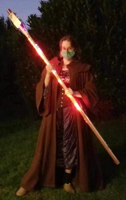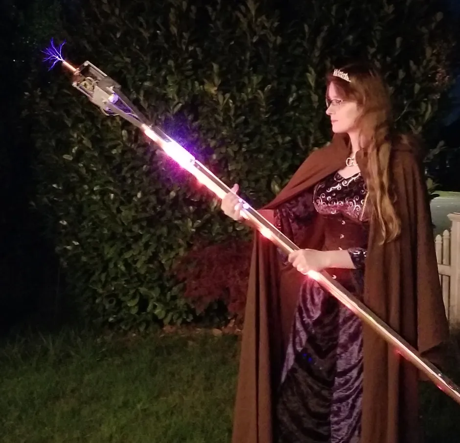 Unfortunately, in Halloween 2024, I dusted off the staff and went as a lightning mage again, but there was a light drizzle, and the staff appears to have partially shorted out. The Tesla coil still works, but the lights flicker or get stuck. I will have to tear it apart and try to fix it sometime.