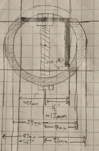 : Draft design for staff cross-section. There is an aluminum angle beam in the middle, forming the core and top face of the staff, a cut PVC pipe forming the rest of the hull, and bolts to hold it all together.And of course, there's tons of level-shifting and miscellaneous circuitry to make it all work, some of it not even used. I was also thoughtful enough to include dedicated lines for a RPi Debug Probe and dedicated charging lines to a socket for the Tesla coil battery.