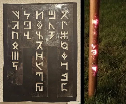 : A black piece of construction paper with cutouts and packing tape windows produces a stencil (left). When assembled above an LED strip but below a layer of painted thin plastic, you get light-up rune effects. I drew all the symbols myself based on vibes; some are actual runes (though no message is conveyed).There are three buttons in the center of the staff (Figure 1). The bottom one simply closes the switch on the Tesla coil, activating it. The Tesla coil can also be activated electronically by a power relay. The middle button activates the Tesla coil through this relay, and also runs a light show. The top button does the same thing, but with a more extensive light show that involves a build-up period.