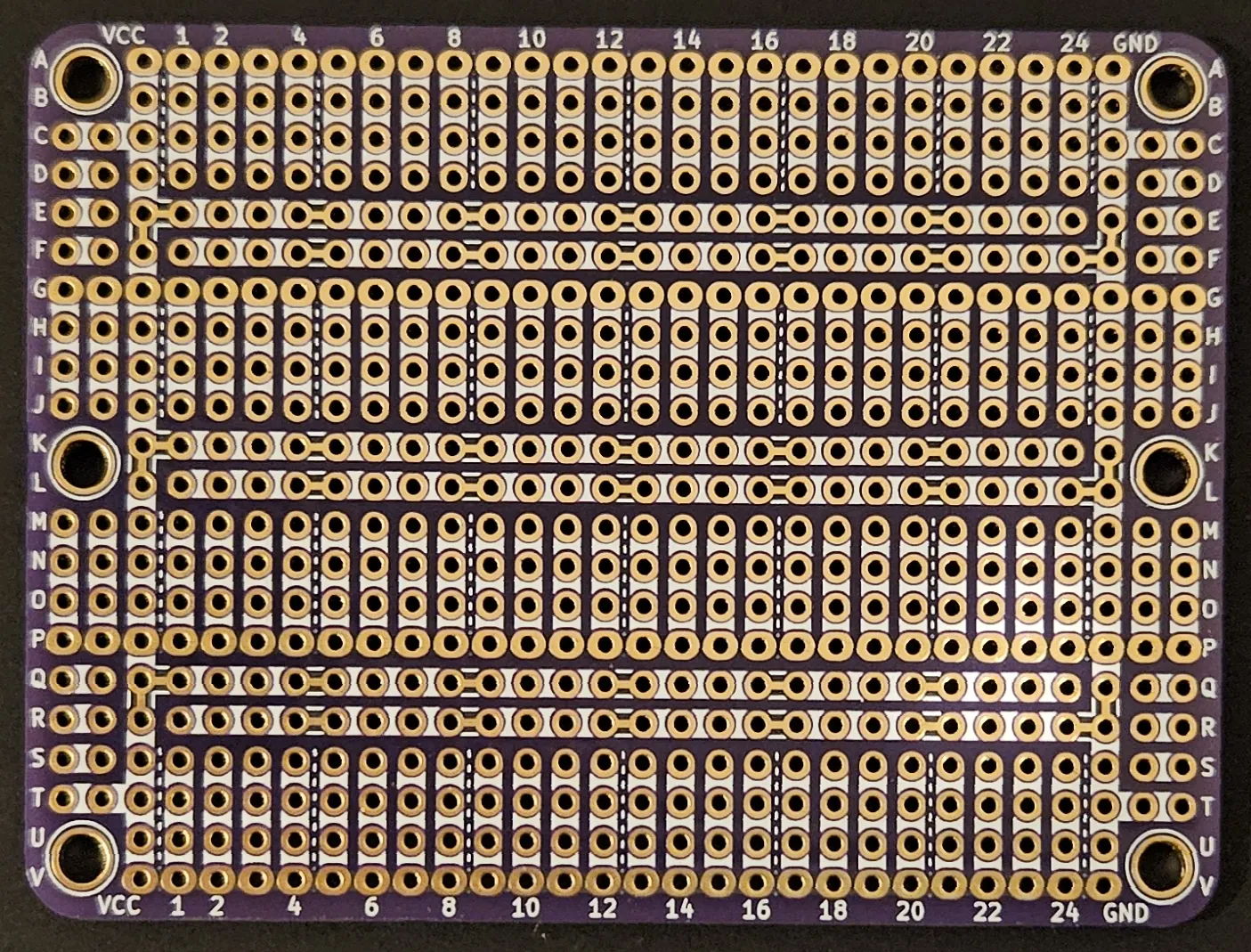 Power and ground route through the middle of these areas, with periodic breakouts and exposed, easily cuttable default-closed jumpers. The rest of the board is short, breadboard-style strips with default-open jumpers between every one, easily bridgeable with soldermask gaps. This gives great flexibility, allowing you to use the built-in copper to its fullest.
