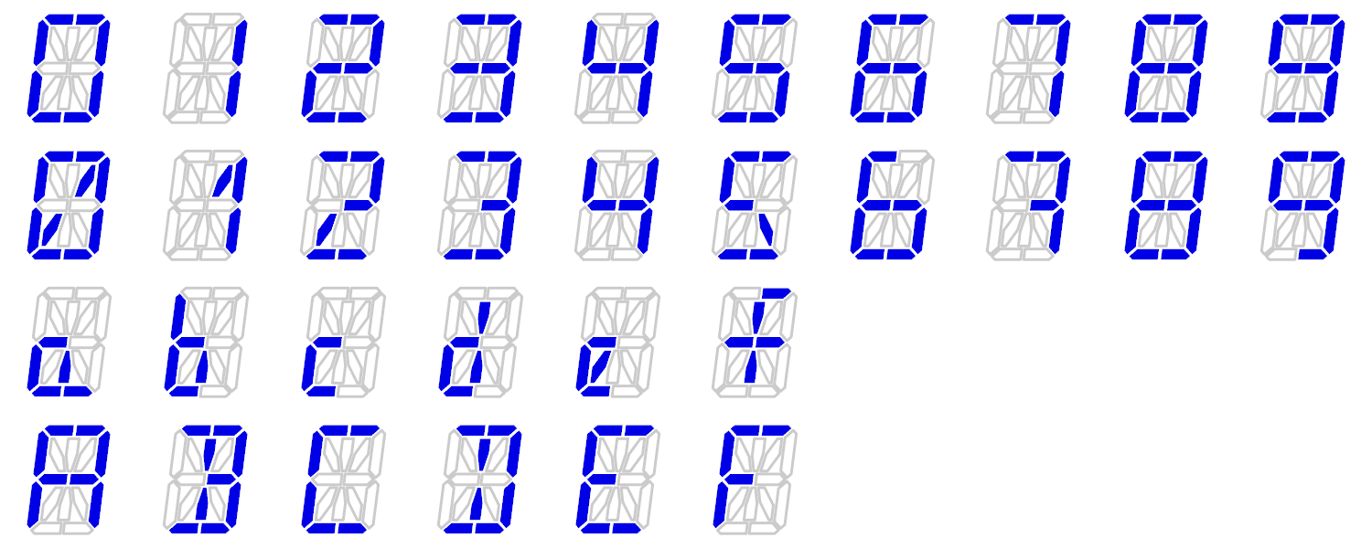 The obvious and common way to do this is with a cheap 7-/8-segment display (Figure 1). However, we quickly realize a problem. If we choose uppercase, then 'A', 'C', 'E', and 'F' are fine, but 'B' looks identical to '8' and 'D' looks identical to '0'. If we choose lowercase, then 'c' and 'd' are fine, but 'a' looks weird, 'b' might be confused with '6', and 'e' and 'f' are impossible (an 'e' that is as tall as an 'E' is possible, but that's bogus and doesn't count).