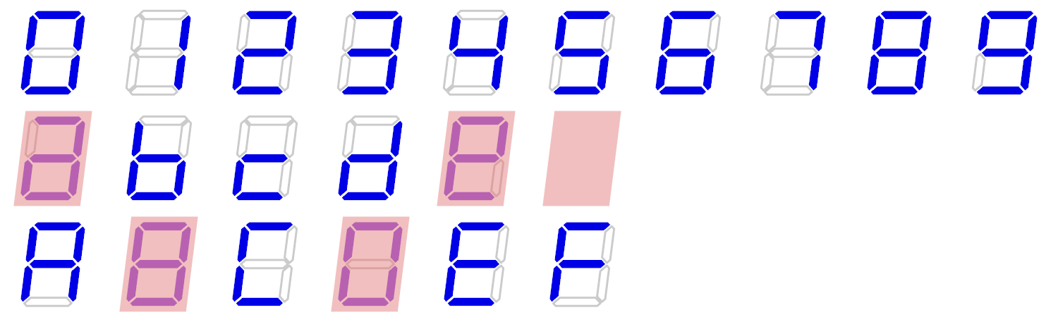 : Possible hex digit glyphs on a 7-/8-segment display. No lowercase 'f' is possible, and some glyphs are ambiguous or wonky (red highlights). (Image by me.)