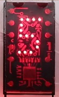The professional turnkey solution for hexadecimal[6] at one time actually existed. TAOS (Texas Advanced Optoelectronic Solutions, a spinoff from Texas Instruments) produced for a long time the TIL311 (Figure 3) (and variant DIS1417[7]), apparently licensing the TI design. The TIL311 basically does exactly what we want: it has 20+2 LEDs (the extra two are for a left and right decimal point) arranged in an unusual pattern (Figure 4) that allows for clear (uppercase) glyphs. You pipe in four bits for the data and the right character shows up. You can even use PWM on a dedicated "blanking" pin to change the brightness. All functions of the chip can be controlled with a convenient 8 bits.