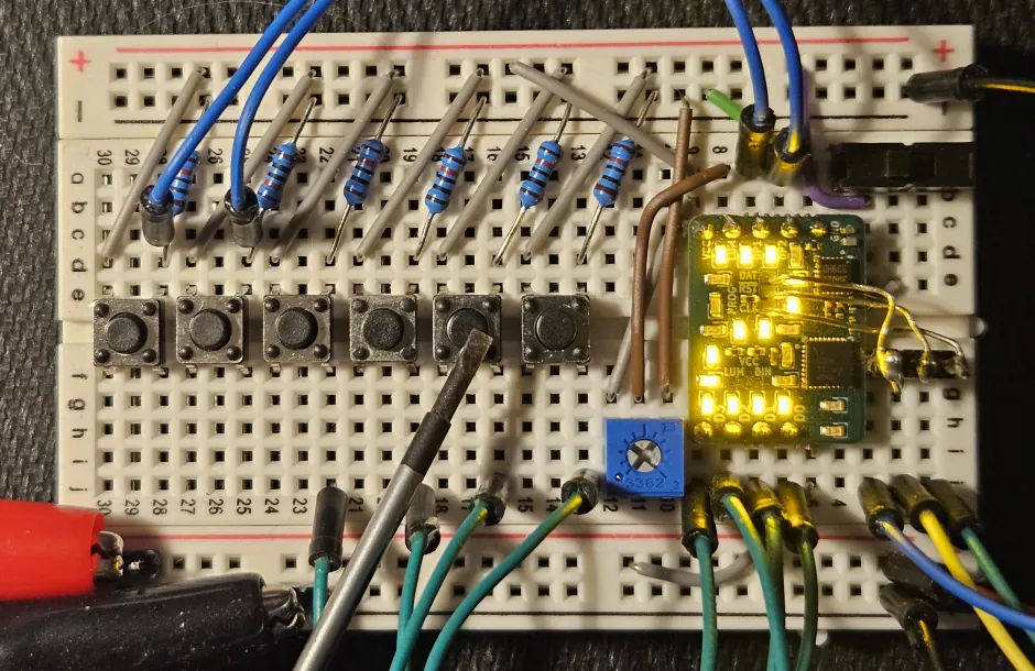 : Testing a prototype hex display on a breadboard. The switch for bit 1 (i.e. value 2) is being pressed with a screwdriver, and the display correctly shows '2'.This project is complete. I made this because the TIL311 was a great part, iconic in the electronics of the 1970s and 1980s, but is now no longer being produced. There is still a hobbyist niche, but even a single antique TIL311 part will set you back about $30 today, which makes using them at scale impractical.